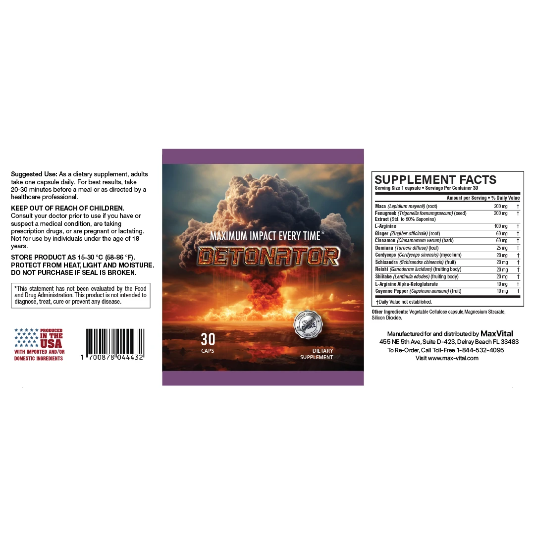 Detonator is built for those who want more—more stamina, more control, more intensity. This potent daily capsule blends powerful botanicals, circulation boosters, and adaptogens to help you stay energized, focused, and fully in command.