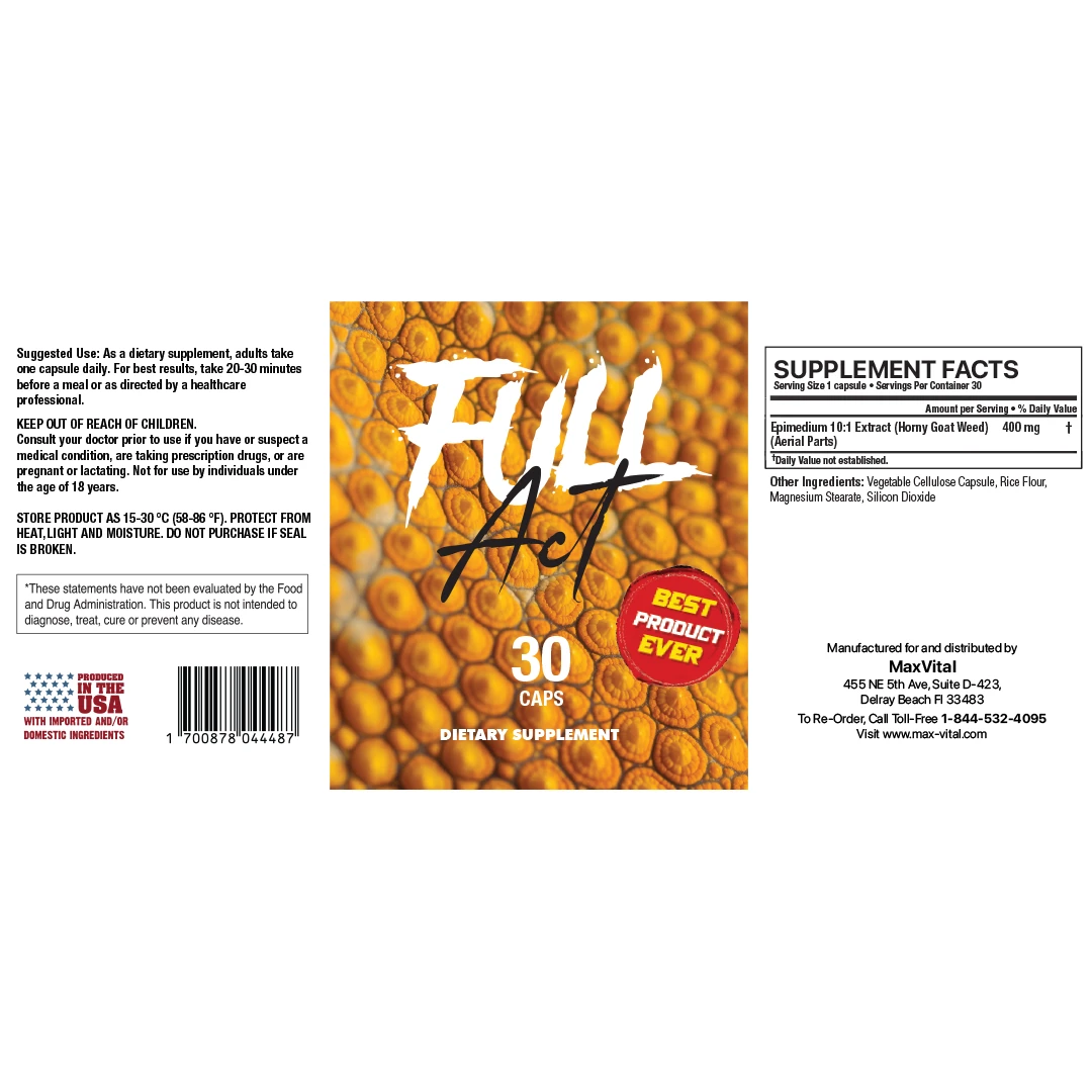 Full Act by MaxVital is a premium vitality and vigor supplement designed to enhance men’s performance and confidence during intimate moments. Powered by Horny Goat Weed, it promotes stamina, energy, and overall well-being.