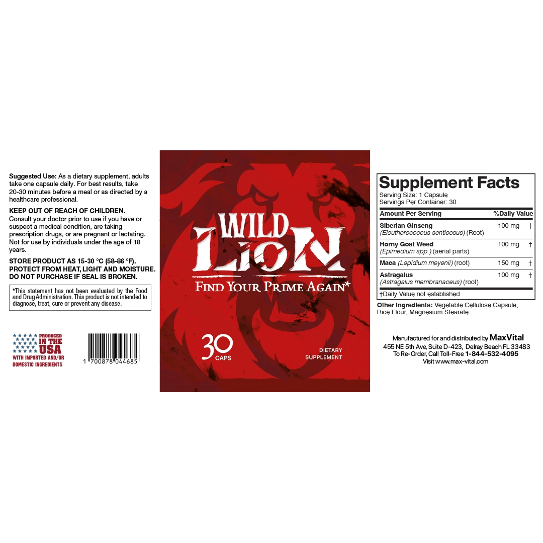 - Wild blend of botanicals: 150 mg Maca root, 100 mg Siberian Ginseng, 100 mg Horny Goat Weed, 100 mg Astragalus per capsule